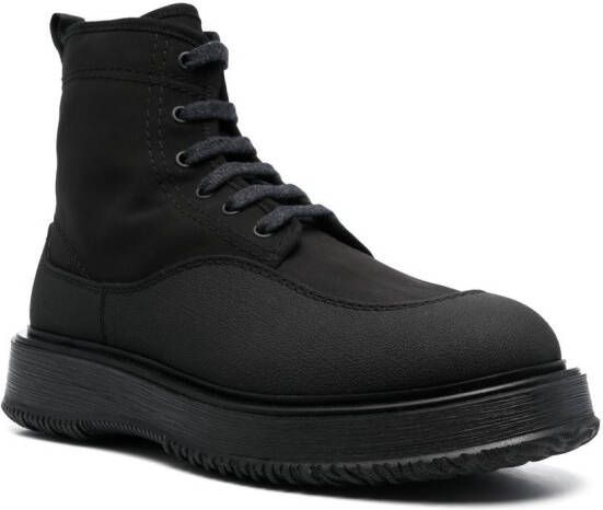 Zwart, tonaal design, logopatch op de tong , logo-relif aan de achterkant, vetersluiting aan de voorkant, dubbele ritssluiting bij de hiel, ronde neus, platte rubberen zool en enkellengte.