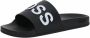 Deze zwarte lichtgewicht badslipper BAY Slid Rblg komt uit de collectie van het merk Boss. Dit model heeft een glad rubberen band met oversized gouden merkopdruk en een rubberen licht voorgevormd voetbed. Het profiel onder de loopzool zorgt voor een goede grip.