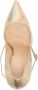 Goudkleurig, iriserend effect, puntige neus, gespsluiting, leren binnenzool met logo en hoge stilettohak.
