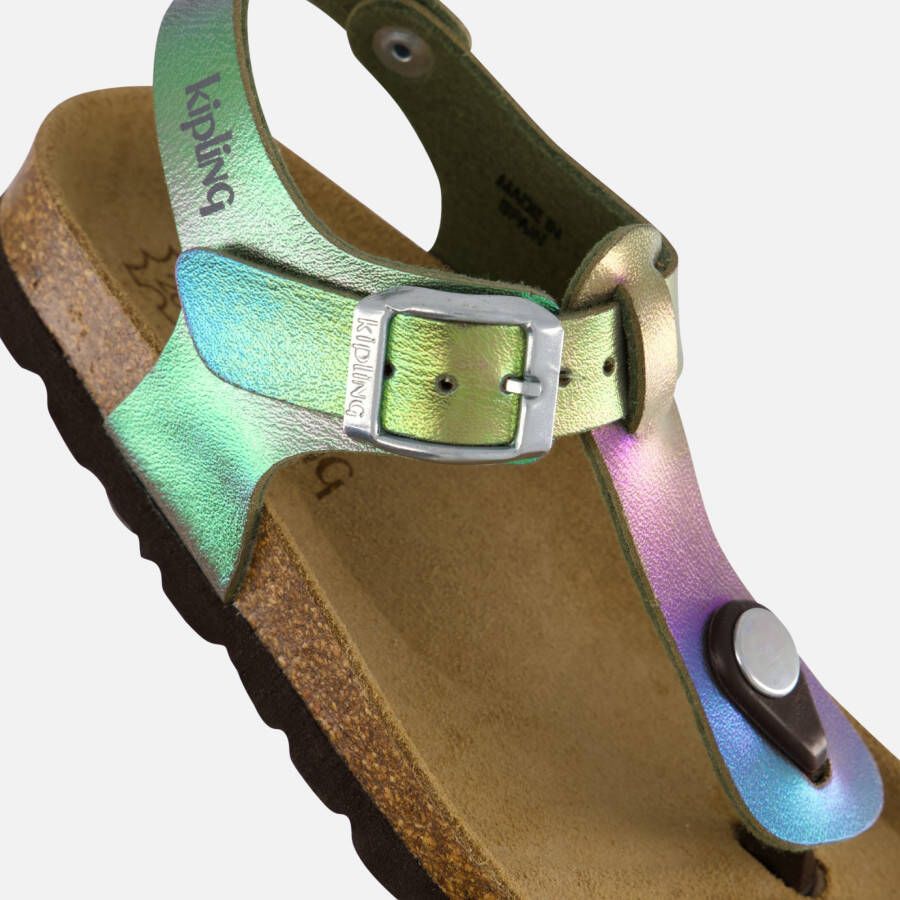 Kipling hippe, trendy en comfortabele meisjes sandaal. Deze teensandaal van Kipling heeft als modelnaam Maria Rainbow 1 en het artikelnummer is: 12465079-0999. De kleur is multicolor oftewel een materiaal wat meekleurt in het metallic leer met een zilveren gespsluiting. De voering is van leer. Het voetbed is een kurken voorgevormd voetbed voor extra draagcomfort. De sandaal is verstelbaar middels de gespsluiting