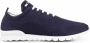 Marineblauw, wit, kalfsleer, gebreide bovenkant, logo-relif op de tong, dubbele ritssluiting bij de hiel, vetersluiting aan de voorkant, amandelvormige neus, leren binnenzool met logo en platte rubberen zool.