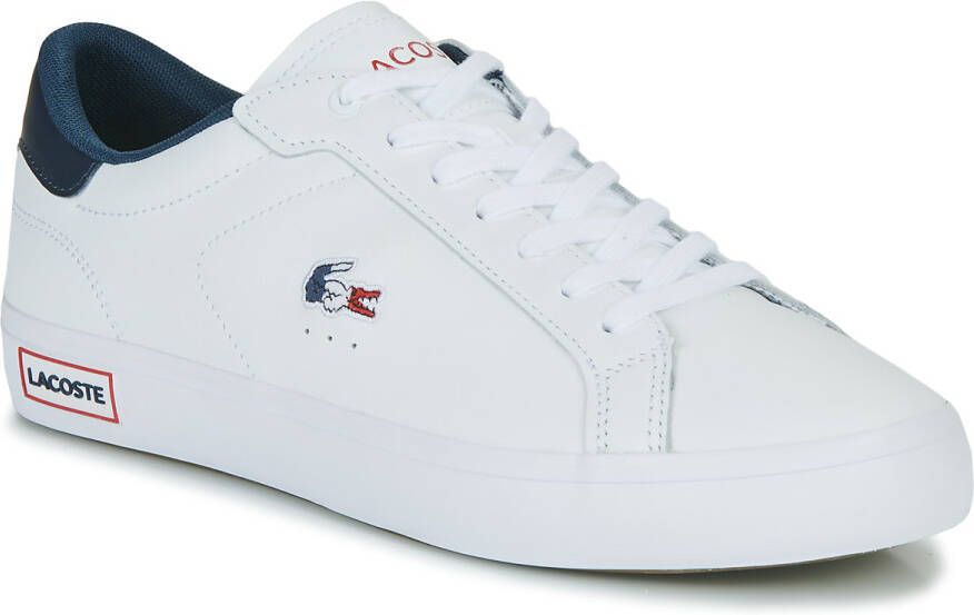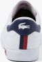 LACOSTE-schoenen. Powercourt-model. Witte kleur. Talon in Marine Color. Logo en details in Marino en rood. Sluiten met koorden. Bruine rubberen zool. Deze beschrijving is automatisch vertaald.