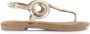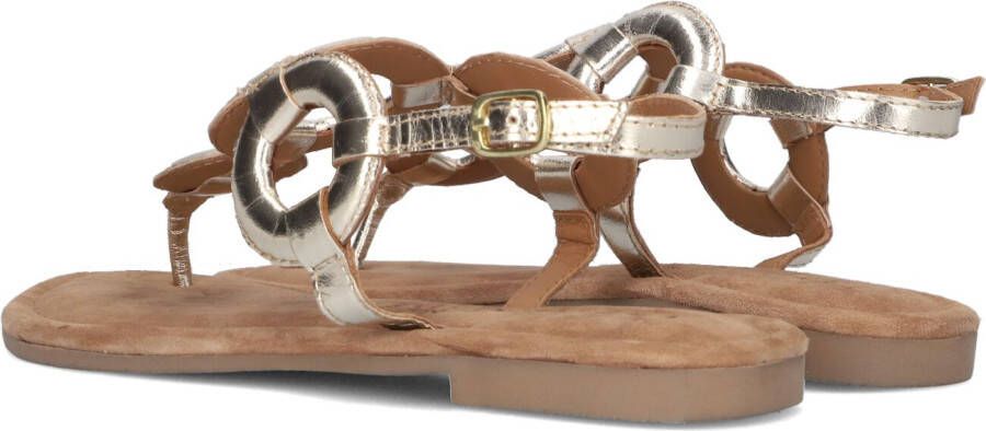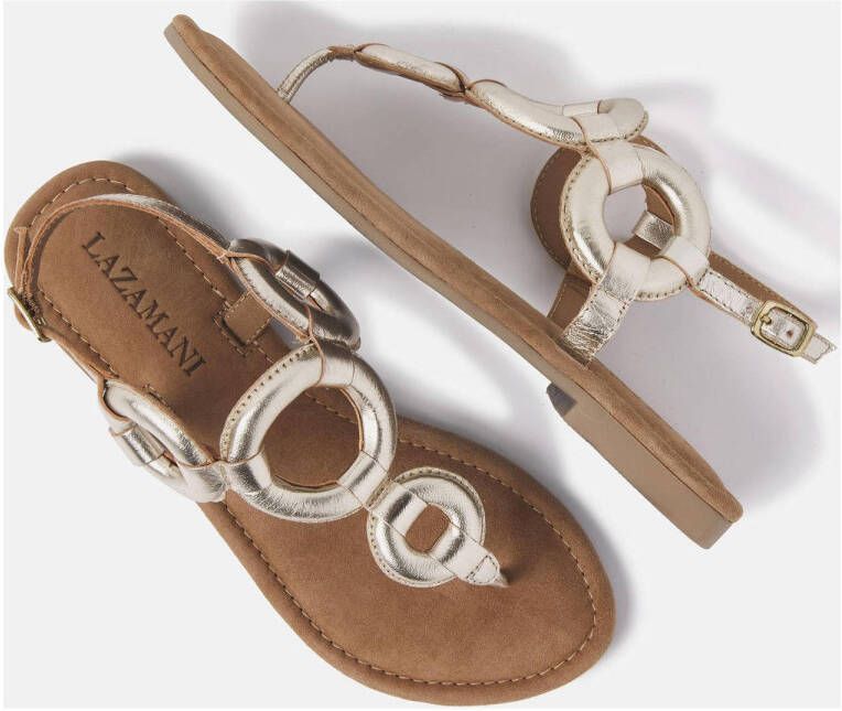 Goudkleurige teensandaal van het merk Lazamani voor dames. De bovenkant is gemaakt van leer met een metallic finish. De slingback kan met de metalen gespsluiting eenvoudig naar je voet worden aangepast.