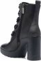 Vetersluiting aan de voorkant, halfhoge hak, bronskleurige hardware en ritssluiting aan de zijkant.