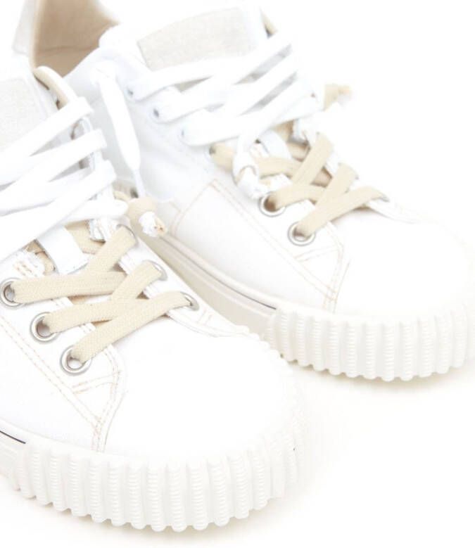 Kalfsleer, sude afwerking, kenmerkend gestikt logo, vetersluiting aan de voorkant, ronde neus en platte rubberen zool.