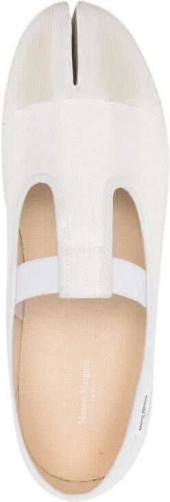 wit canvas gerafeld effect rubberen neus kenmerkende Tabi neus elastische band mini logo label binnenzool met logo kenmerkende nummerprint aan de achterzijde rubberen zool slip-on stijl
