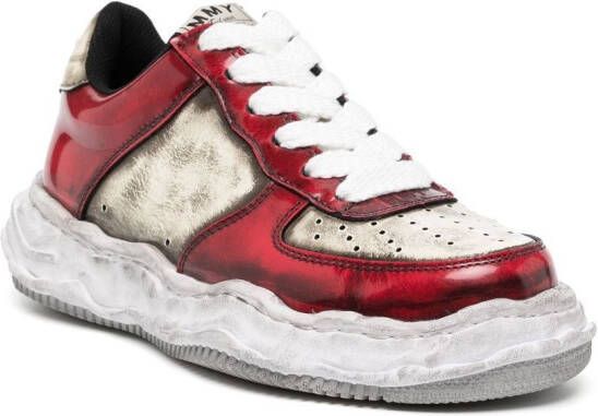 Rood, wit, lakleer, distressed-effect , vlakken met colourblocking, logopatch op de tong , geborduurd logo op de voorkant, logo op het hielstuk, voorgevormd voetbed, chunky rubberen zool, geperforeerde neus, ronde neus en vetersluiting aan de voorkant.