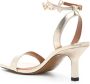 goudkleurig schapenleer metallic finish schakelkettingdetails vierkante open neus enkel teenbandje enkelbandje met gespsluiting voetbed met logo hoge hak rubberen buitenzool