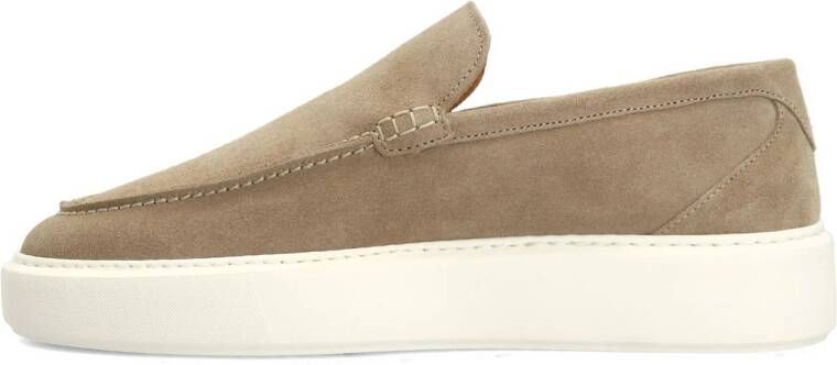 Beige sude loafers van Manfield. De loafers hebben een witte plateauzool van 4 cm en we adviseren als bescherming en verzorging de sude/ nubuck spray in transparant