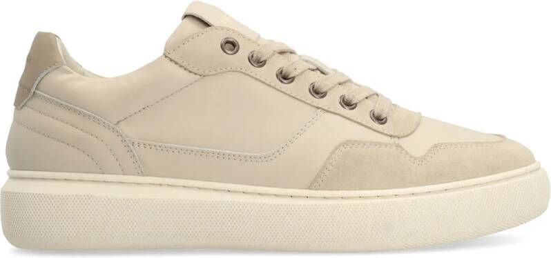 Beige sude sneakers van Manfield met grijze details en vetersluiting. De zool is 3 cm hoog en we adviseren als verzorging en bescherming de Collonil Carbon Pro spray.