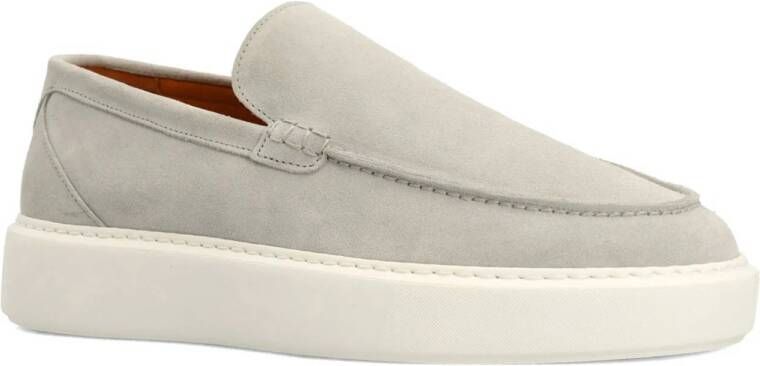 Licht grijze sude loafers van Manfield. De loafers hebben een hoge witte zool van 3 cm hoog en we adviseren als verzorging en bescherming de Sude/ nubuck spray in transparant