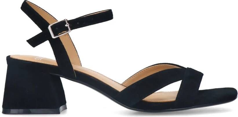 Zwarte sude sandalen van Manfield met hak van 5 cm en gespsluiting rondom de enkels. We adviseren als verzorging en bescherming de sude/nubuck spray in transparant