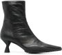 Zwart, kalfsleer, zilverkleurig materiaal, ritssluiting aan de zijkant, puntige neus en toelopende middelhoge hak.