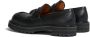 Zwart, leer, zilverkleurig materiaal, penny loafer stijl, ronde neus, slip-on stijl, leren binnenzool met logo en platte rubberen zool.