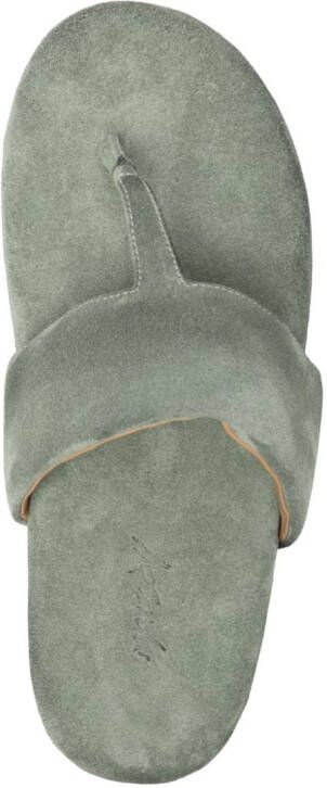 saliegroen omgekeerd leer ronde open neus T-bandje slip-on stijl leren binnenzool met logo platte zool