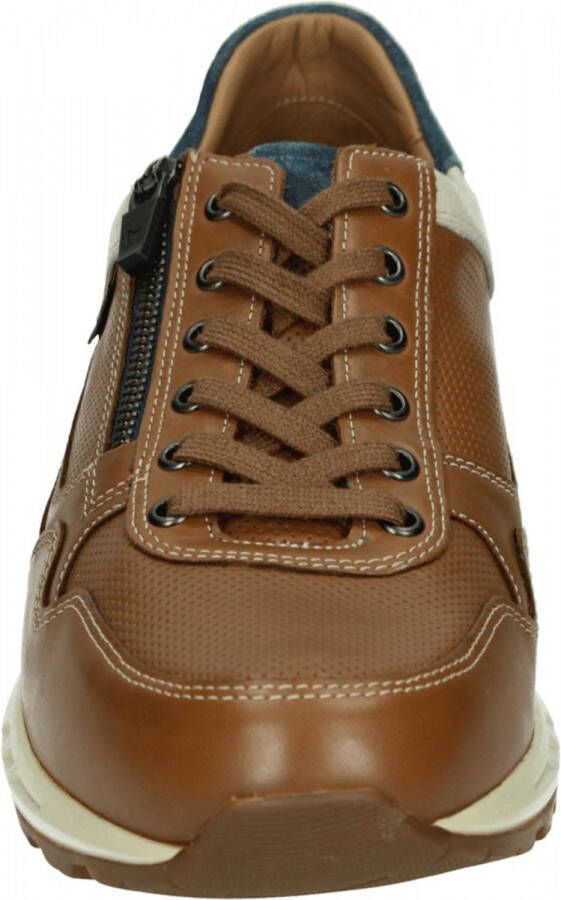 Sneaker van Mephisto in taupe nubuk met donkerblauwe accenten en contraststiksels met op de achterzijde een roomwit leren hielstuk. De bewerkte roomwitte rubberzool met blauwe spie heeft een bruin loopvlak met profiel. De sportieve schoen is naast een taupe kleurige platte veter, geregen door metaalkleurige veterringen, voorzien van een rits aan de buitenzijde van de voet voor een makkelijke instap. Artikel Bradley 25537/3655/1580 is leergevoerd en voorzien van een uitneembaar voetbed.