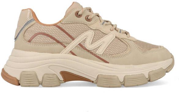 Stoere zandkleurige Kristy sneaker voor dames. Dikke ronde veters. Grove profielzool en metalen eyelets. Laklederen detail op de hiel. M-logo op de zijkant. Spuit de schoenen regelmatig in tegen water en vuil.