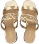 goudkleurig leer metallic afwerking logopatch aan de voorkant vierkante open neus slip-on stijl voetbed met logo halfhoge blokhak rubberen zool