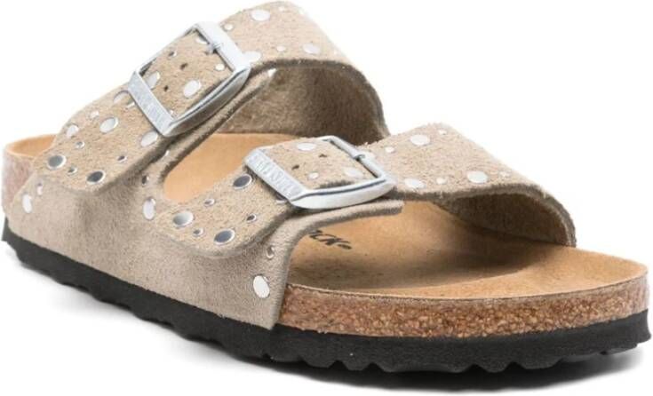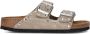 Damesslippers Arizona Rivet 1029390 uit de Birkenstock collectie. Deze sandalen hebben een taupekleurige sude bovenkant. Het speciaal voorgevormde sude voetbed biedt extra loopcomfort. De twee verstelbare wreefbanden zijn voorzien van zilveren studs en zilverkleurige logogespen. Een EVA-zool en branding aan de zijkant maken dit