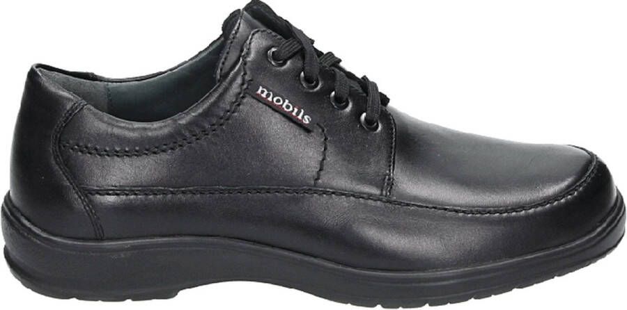 Mooie veterschoenen voor heren van Mephisto van een prettig, hoogwaardig getextureerd glad leer. De schoen is iets breter dan gemiddeld. De hak bestaat uit een doorlopend vlak. Het artikel beschikt over een vetersluiting. De schoen valt normaal.