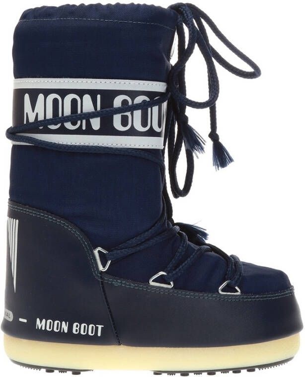 Navy blue 'Classic Nylon' lace-up snow boots from Moon Boot featuring white graphic print with branding and beige and black rubber sole at the base.