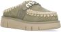 Slippers voor dames Bounce Clog Metal Logo uit de collectie van MOU. Deze slides hebben een upper van zacht sude in een groene tint. De binnenkant is in lekkere warme schapenwol met een vast voetbed uitgevoerd. De opvallende handgestikte bewerking is kenmerkend voor het merk MOU. De band op de wreef is voorzien van een zilverkleurig
