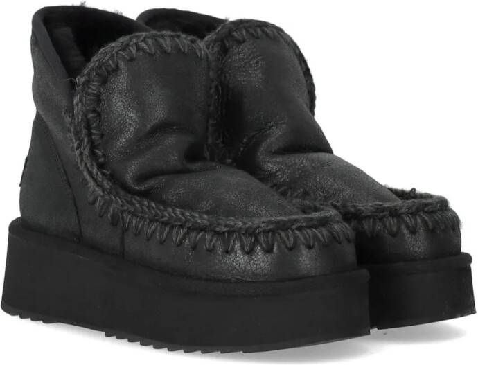 Upgrade je winterse stijl met deze Mou Eskimo Platform Enkellaarzen in zwart sude met metallic details. Voorzien van gehaakt wollen stiksels, een EVA rubberen zool en warme schapenvachtvoering. De hoogte van de zool is 4 cm