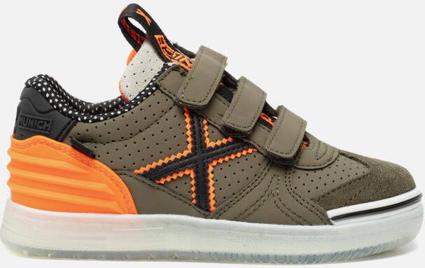 Stoere klittenband sneaker, G3 KID Velcro, van het merk Munich, met uitneembaar voetbed. De binnenzijde is gevoerd met textiel en de buitenzijde is een combinatie van groen suède en leatherlook. Opvallende details zijn de perforaties op de zijkant en tong, het zwarte X embleem met oranje biesjes en kartelrandafwerking op de zijkant, het stikselwerk op de neus, de oranje verstevigende hielcap met lijntjes reliëf en de rubberen stootrand rondom de neus met zwarte accentstreep. Met de driedubbele klittenbandsluiting in combinatie met de hanige aantreklus op de tong trek je ze supersnel aan en uit. De semi transparante loopzool heeft een gripvast profiel, waarmee je een veel grip ervaart tijdens al je avonturen