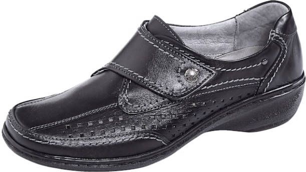 Verwisselbaar voetbed, geschikt voor losse inlegzolen. Platte hak van 3, 7 cm. Profielzool. Gepolsterd. Wijdte K: voor zeer brede voeten. De schoen heeft een klittenbandsluiting. De schoenmaat wordt aangegeven in Europese maten.
