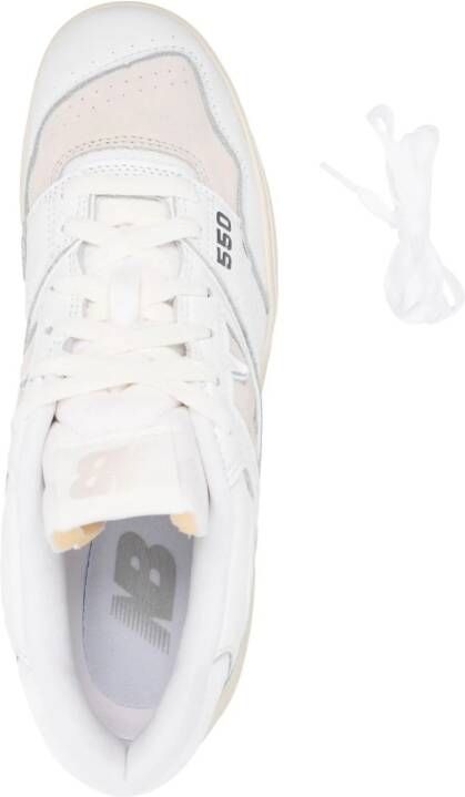 Wit, kalfsleer, design met vlakken, logopatch aan de zijkant, logopatch op de tong , ronde neus, vetersluiting aan de voorkant en rubberen zool