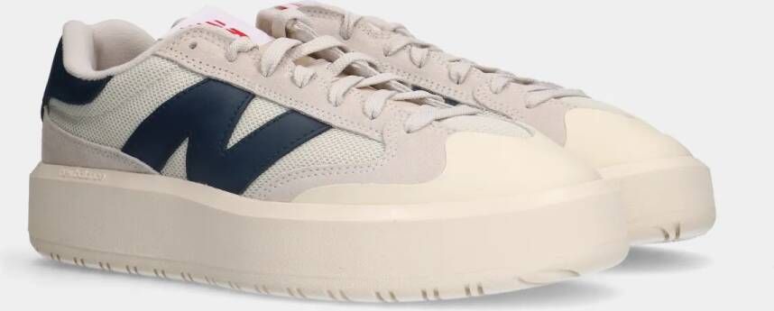 CT302 white/navy sneakers van het merk New Balance. De moderne wit/donker blauwe trainers met dikke rubberen zool van 4 cm zijn geïnspireerd op het tennis-model. De upper heeft een combinatie van sportief mesh en leren overlays. De foam tong van de schoen heeft een wit/rood merkembleem.