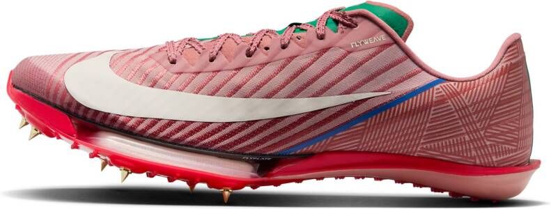 De Maxfly 2 is gemaakt voor de snelsten ter wereld en staat weer in de startblokken. Hij is ontworpen voor de 100 tot 400 meter (ook horden) en combineert een ultra-agressief gevoel met de responsiviteit van een Air Zoom unit zodat de snelste sprinters ter wereld vooruit vliegen. Dit speciale design is genspireerd op The Armory in New York, waar atleten van alle niveaus welkom zijn in de blokken. Behind the Design:Het bovenwerk heeft dezelfde kleur als de atletiekbaan The Armory. Het groen doet denken aan het middenterrein van The Armory. Het blauw verwijst naar de warming-upzone. De rode accenten zijn gebaseerd op het logo van The Armory. De gekruiste print verwijst naar het iconische plafond., Flyweave constructie:Nike Flyweave constructie op het bovenwerk zorgt voor een stevige pasvorm die zich aanpast aan verschillende voetvormen., Flyplate van koolstofvezel:De vorm en stijfheid van de Flyplate van carbon houden je scherp en zorgen voor minimale vertraging., Zoom, Zoom:De Air Zoom unit in de voorvoet heeft twee compartimenten voor veerkracht en stabiliteit van start tot finish., Wat is er nieuw aan de Maxfly 2?:De Flyplate is lichter en responsiever dan de Maxfly, en de vorm en stijfheid van de Flyplate geven je een stuwend gevoel. De middelste spike van Maxfly is verwijderd en het verhoogde platform bij de grote teen zorgt ervoor dat de spikes stabieler aanvoelen.