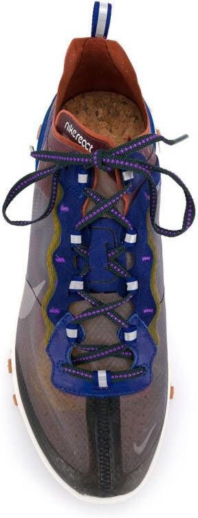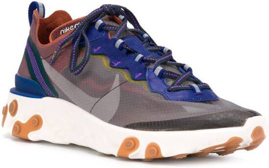 React Element 55 sneakers van Nike voorzien van lusje aan de achterkant, witte rubberen zool, kenmerkende Nike swoosh, verfspatten effect, lussluiting en contrasterend colourblock design.