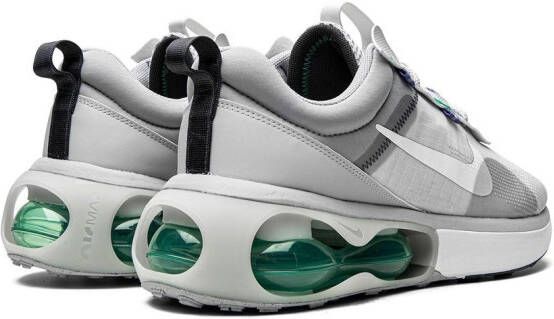 Grijs, kenmerkend Swoosh logodetail, ronde neus, vetersluiting aan de voorkant, dubbel lipje bij de opening, binnenzool met logo en rubberen zool met Max Air demping
