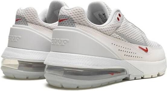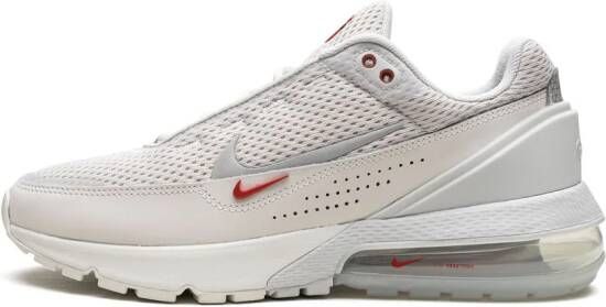 Lichtgrijs, gebreide bovenkant, kenmerkend Swoosh logodetail, ronde neus, vetersluiting aan de voorkant, logopatch op de tong en rubberen zool met Max Air demping.