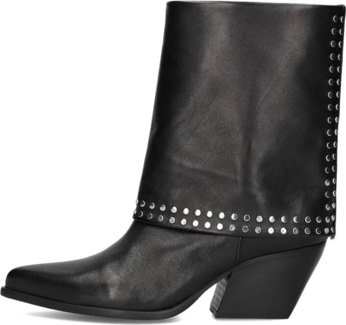 Stap in stijl met deze As 144 enkellaarzen van Notre-V. Het bovenwerk bestaat uit zwart gladleer met een overlapping. De overlapping is afgewerkt met zilverkleurige studs voor een stoere touch. De puntige neus, de schuine hak en de brede schacht geven een city western vibe aan je outfit. Het leer aan de binnenkant zorgt voor comfort, terwijl de rubberen zool grip biedt. Combineer deze enkellaarzen met een stoere jeans en een oversized blouse voor een trendy look. Of draag ze onder een flowy jurk voor een vrouwelijke touch.