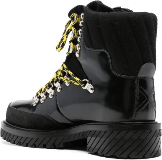 Zwart, kalfsleer, kenmerkende diagonale strepen, contrasterende veters, ronde neus, vetersluiting aan de voorkant, binnenzool met merk, dikke rubberen zool en enkellengte.