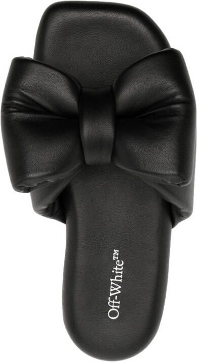 Zwart, leer, gewatteerd design, strikdetail, open neus, enkel teenbandje, slip-on stijl, platte zool en binnenzool met merk.
