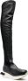Zwart, kalfsleer, ritssluiting aan de zijkant, lengte tot boven de knie, ronde neus, contrasterende rubberen zool, sleehak met plateauzool en 3D details.