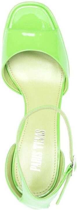 Appelgroen, kalfsleer, lakleren afwerking, binnenzool met merk, enkelbandje met gespsluiting, plateauzool en hoge blokhak.