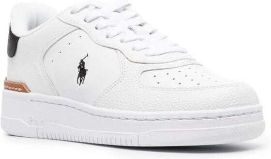 Wit, kalfsleer, kenmerkend Polo Pony patroon, contrasterende hak, vetersluiting aan de voorkant, ronde neus en platte rubberen zool