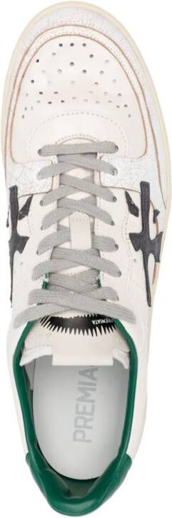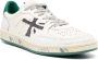 licht beige/veelkleurig kalfsleer gebarsten effect vlakken logo applicatie aan de zijkant logoprint en tekst op de tong contrasterende hiel print aan de zijkant platte rubberen zool veters aan voorkant