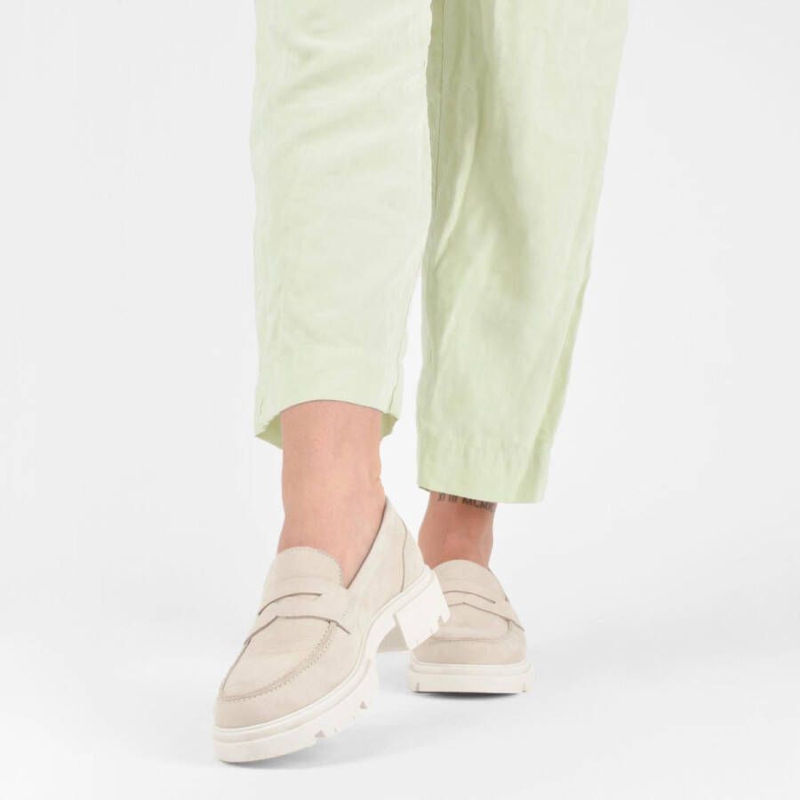 Deze 'SOPHIE' chunky loafer voor dames van PS Poelman heeft een bovenwerk van nubuck suède leer in de kleur licht beige. Het model heeft een voering van leer, een vast voetbed, klassieke mocassin details en is super comfortabel. Het kleurgebruik van een nude tint past helemaal in het huidige mode beeld. Super hip dus. Daarnaast zijn ze perfect voor een mooie zonnige dag gecombineerd met een zomerse outfit!