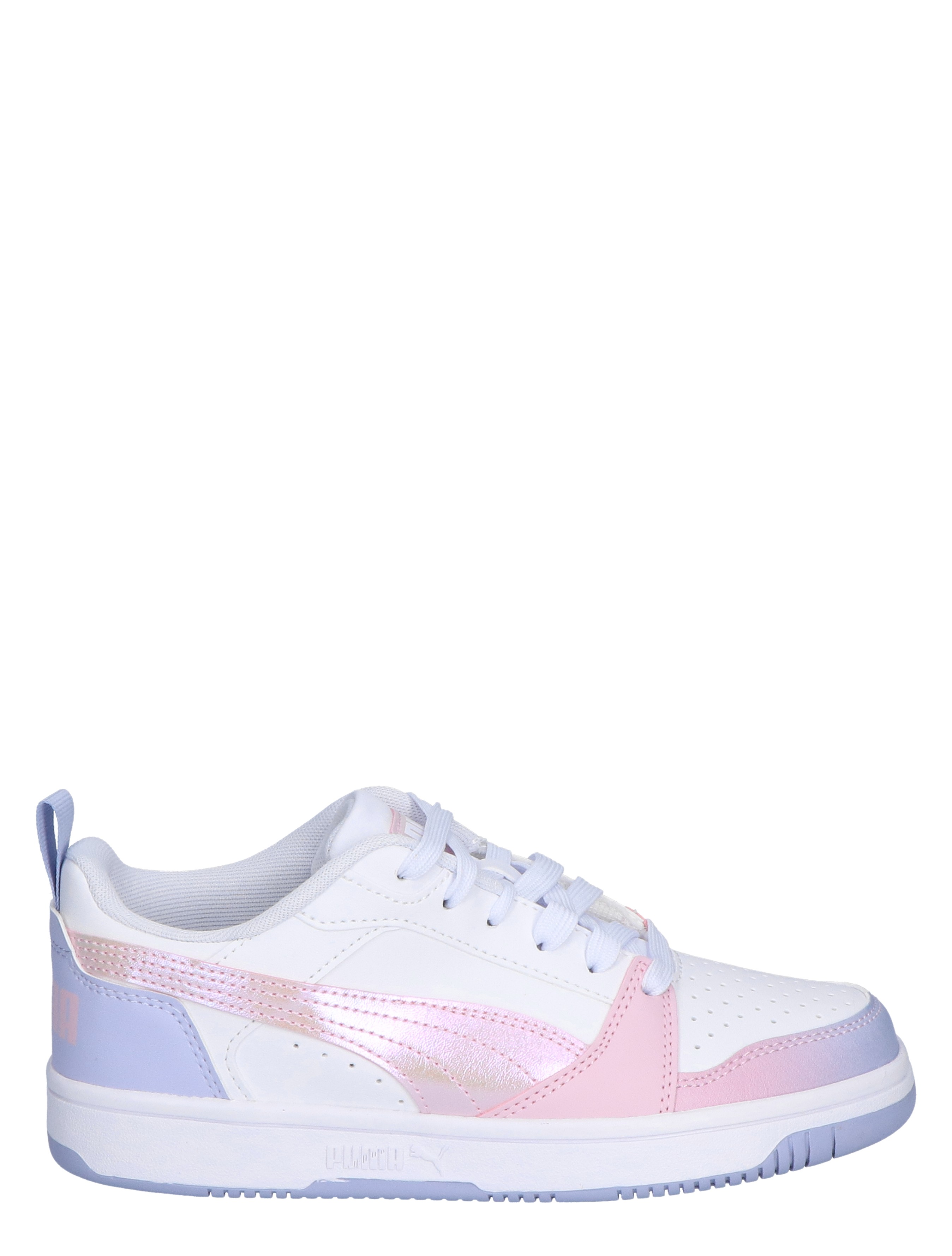 Puma Rebound V6 Low sneaker in white black green voor kids. De door basketbal genspireerde Rebound Low V6 is een laag model voor dagelijks gebruik uitgevoerd in PU met zachte kleuren en een metallic Puma streep. Het gerecycled PU materiaal van het bovenwerk is gemaakt met ten minste 30% gerecycled materiaal en de zool is gemaakt van minimaal 10% gerecycled materiaal, als eenstap richting een betere toekomst.