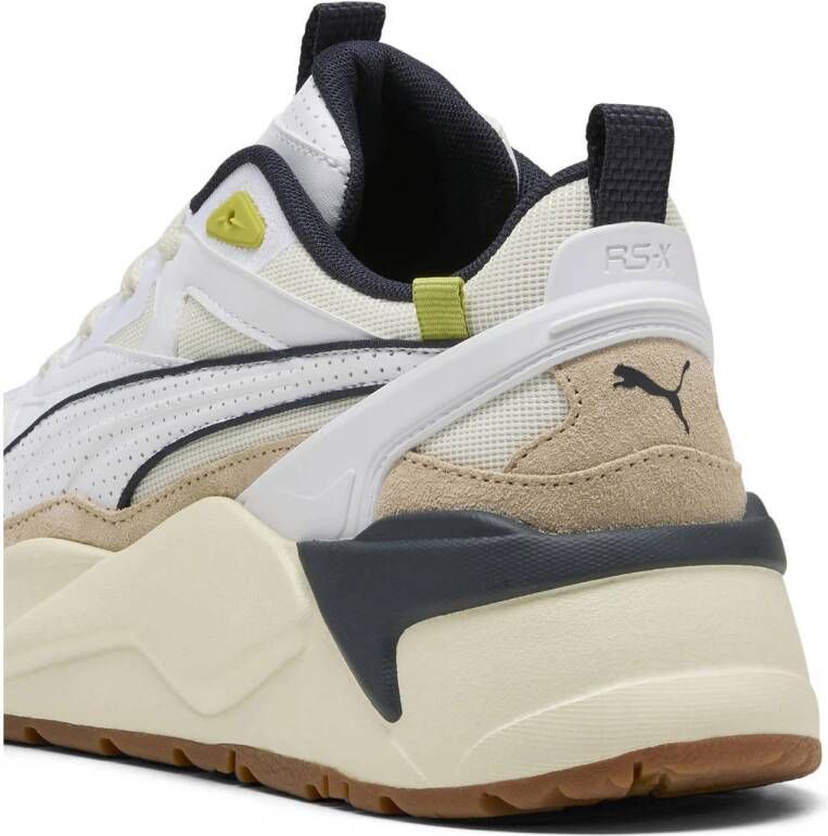 Lichtgewicht sneakers uit de PUMA RS-X Collection voor heren. Deze sportieve schoen in retrostijl, de RS-X Efekt Perf 401265-02, heeft een upper van mesh, sude en imitatieleer in off-white, wit en lichtbruin met zwarte accenten en geperforeerde afwerking. De binnenkant is gemaakt van stof en voorzien van een uitneembaar voetbed. De stevige,