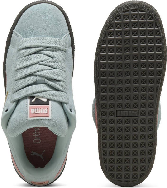 Een klassieke kick krijgt een boost met deze Suede XL-sneakers voor junioren. In een Mint-kleurstelling met Rose Mauve-details, behouden deze low-profile sneakers de kenmerkende designlijnen met een sude bovenkant. Ze hebben een dikke vetersluiting en een gevoerde tong en enkelkraag. Deze sneakers zitten op een gestapelde platformtussenzool en zijn afgewerkt met een goudkleurig woordmerk en de legendarische PUMA Formstrip op de zijkanten.. Material: Bovenwerk van leer/synthetische zool
