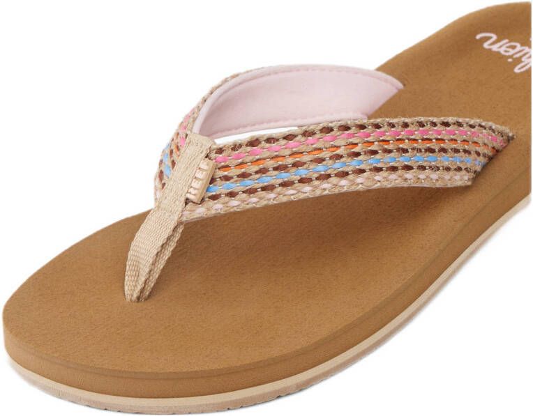 Dit zijn de Baja Elana teenslippers van Reef voor dames. Het bovenmateriaal en de voering zijn gemaakt van textiel. De platte zool zorgt voor een comfortabele pasvorm tijdens het lopen zonder sluitingen