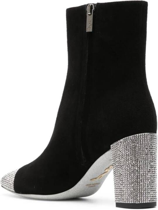 Zwart/wit, kalfssude, verfraaid met kristallen, ronde neus, contrasterende neus, ritssluiting aan de zijkant, leren binnenzool met logo, enkellengte, hoge blokhak en leren zool.