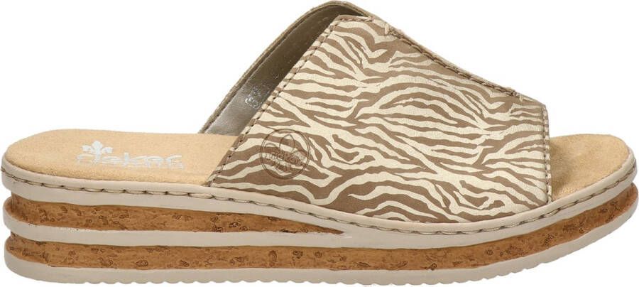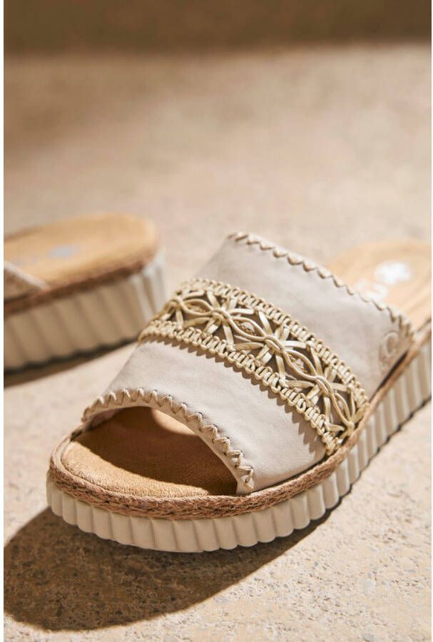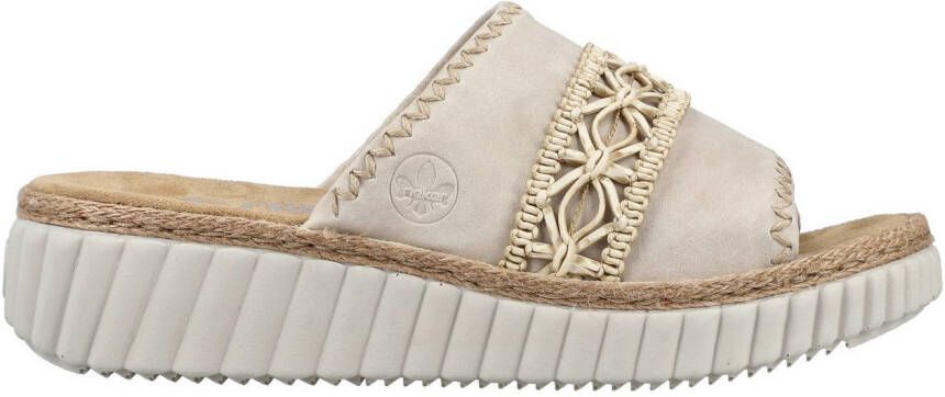 Rieker dames slipper Met de comfortabele slippers van RIeker zit jij wel goed op de warme dagen. Uitgevoerd in imitatieleer met decoratieve band. Gevoerd met textiel wat een aangenaam gevoel heeft, ook op de blote huid. Voorzien van Rieker's Antistress-voetbed. DEze geeft optimale demping en hoog comfort. Afgewerkt met een rubberen loopzool die door de touw afwerking een leuke zomerse look heeft.