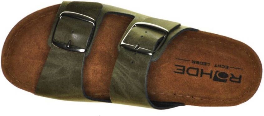 Deze bruin gekleurde Rohde slippers zijn gemaakt van leer. De slippers zijn voorzien van twee verstelbare klittenbandsluitingen boven de wreef en boven de tenen. Hiermee kan de pasvorm naar wens verstelt worden. Ter decoratie zijn er merkopdrukken en inzetten op het bovenwerk aangebracht. De flexibele rubberen zool is voorzien van een comfortabel voetbed van natuurkurk met daarbovenop een laagje leer, dit zorgt voor een zacht gevoel tijdens het lopen
